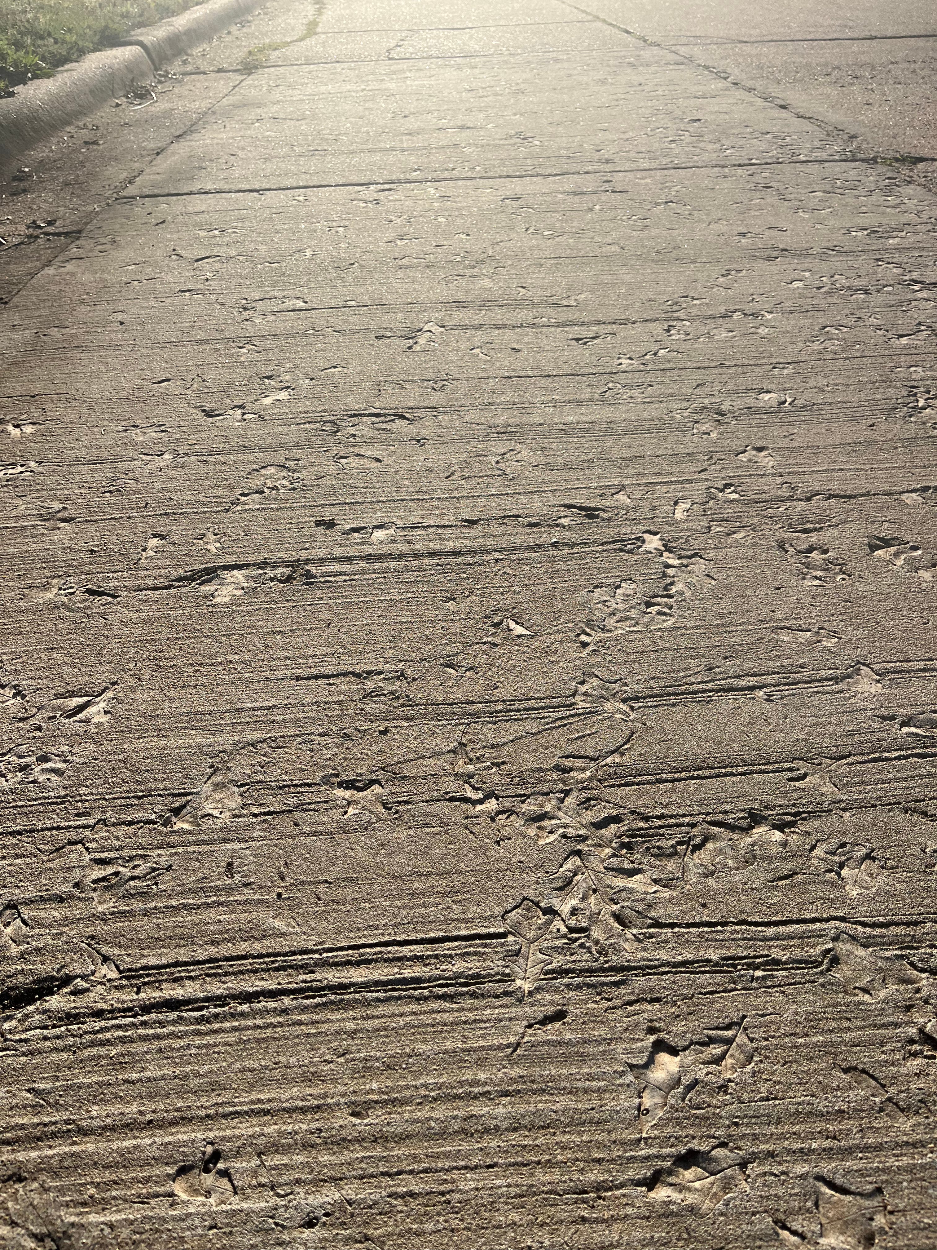 This patch of concrete is in front of my house, and I have walked past it almost every day I've lived here. The street here is lined with oak trees, and if you look close you can see the imprint of leaves in the concrete. It's fascinating that something as light as a leaf believe such a lasting imprint in something as hard as concrete. I can only happen of course because they fell on her on the concrete was soft.