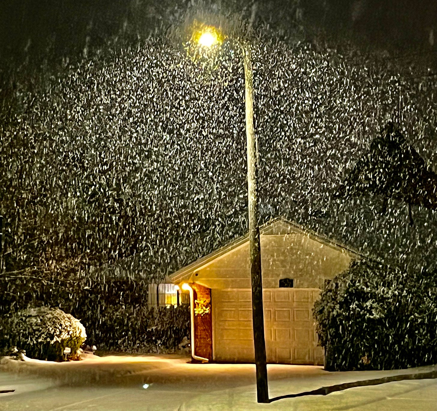 I stepped outside for some quiet at the end of our snow day, and caught the snow still falling. It’s amazing that so many little flakes can add up to something so great over time. It snowed practically all day, and even when the flakes seemed big it’s hardly enough to amount to all that we got. I read that in one cubic inch of snow there’s around 1,000 snow flakes. After some math (from Chat GPT) I learned that to cover an area the size of my yard with 1 inch of snow it would take 28.8 million snowflakes, and to cover all of Stephens County, OK it would take 3.577 quadrillion snowflakes. And we got more than one inch, across much of Oklahoma!