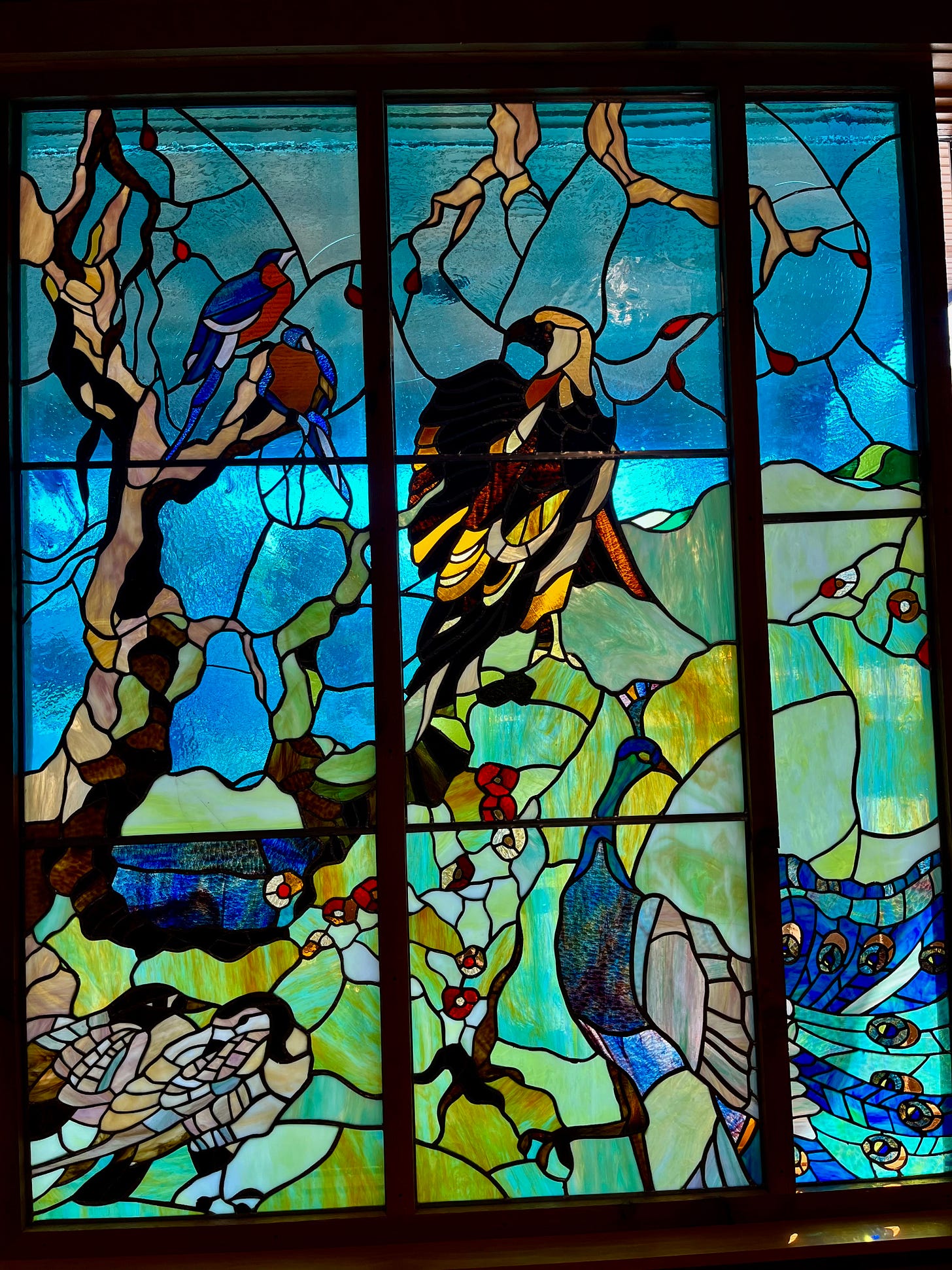 While traveling recently I got to see this piece of stained glass up close and personal. I even got to watch as some others like it were being made. It's a slow process that uses hundreds of small pieces to make one gigantic picture. The end result is always stunning.