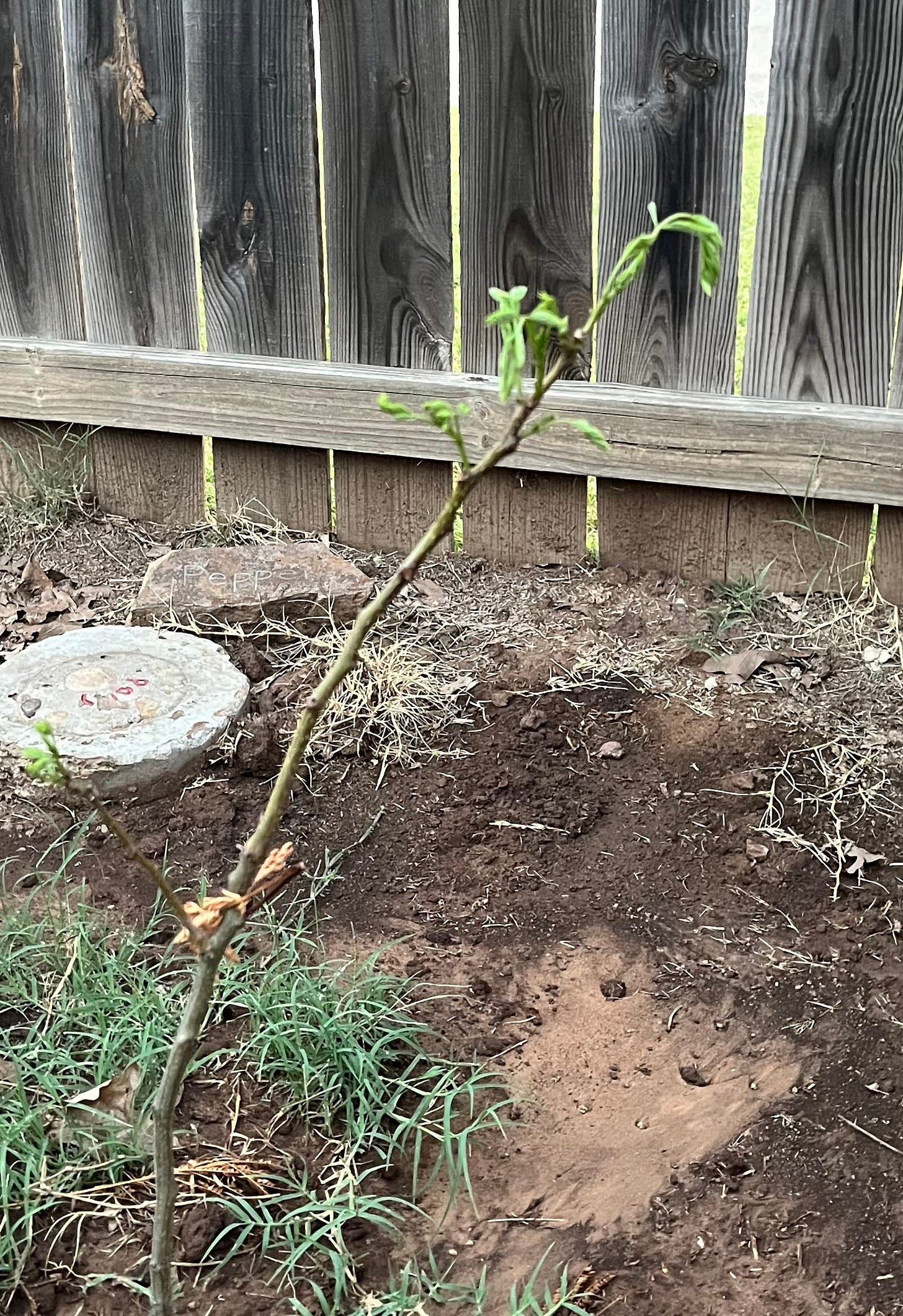 It may not seem like much, but those few green leaves are the signs of life I've been looking for. Even in the midst of this extreme heat, things are still growing. I transferred this tree from another place to the spot I wanted it, right in the worst part of summer. But I faithfully watered it and kept an eye on it, and now it seems like the work is paying off.